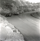 Construction trucks driving on road during east side road repair and turn out construction. ; ZION Museum and Archives Image 002.13.01-47of53 ; ZION 15933