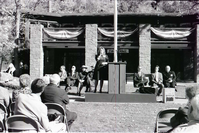 BW Photos of the Zion Lodge Rededication Ceremony. Superintendent Harold (Harry) Grafe speaking with man and woman.