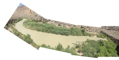 Huisache is on a rubbly alluvial cone on the Mexican side. The photo point is on a limestone ledge above camp. To access the ledge walk upstream at the base of the ledge and look for a ramp up, then turn back towards camp. This trail will switch back downstream quickly. Once on top follow one of several game trails downstream to a point on a ledge above the camp.