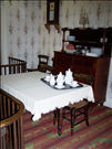 Images from the interior of the Lincoln Home. The wallpaper, carpeting, and draperies are reproductions of period patterns. Artifacts in the photos - furniture, dinnerware, knick-knacks, etc. - are largely period pieces, with only a handful of reproductions.