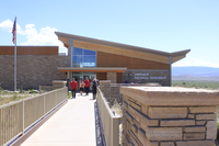 A view looking down the entrance bridge to the Quarry Visitor Center with people visible at the far end.