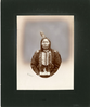 LIBI_00312_11187; Albumen cabinet photograph. This portrait depicts Crow King, a Hunkpapa Sioux. He is seated in front view. He is wearing a U.S. Army Jacket and a bone breast plate. His braids are covered in fur. There is one feather in his hair, cocked to the right. The background is very fuzzy. A white rectangle appears between the subject’s hands. The words “Crow King”, barely visible, are printed on it. “Barry” is printed on the image and on the mount. A handwritten note in orange on the verso reads: “Crow King.” This image was created by D.F. Barry in 1881. It is an original image. ; album, photograph;Courtesy of the National Park Service, Little Bighorn Battlefield National Monument, LIBI_00312_11187, D. F. Barry, "Crow King in an Army Jacket and Bone Breast Plate," 1881.