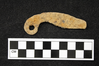 A rusty brown metal items with a hole at one end. Item is curved, 8 cm in length and wide rangers from 2 cm then down to 1 cm and then to 1 1/2 cm.