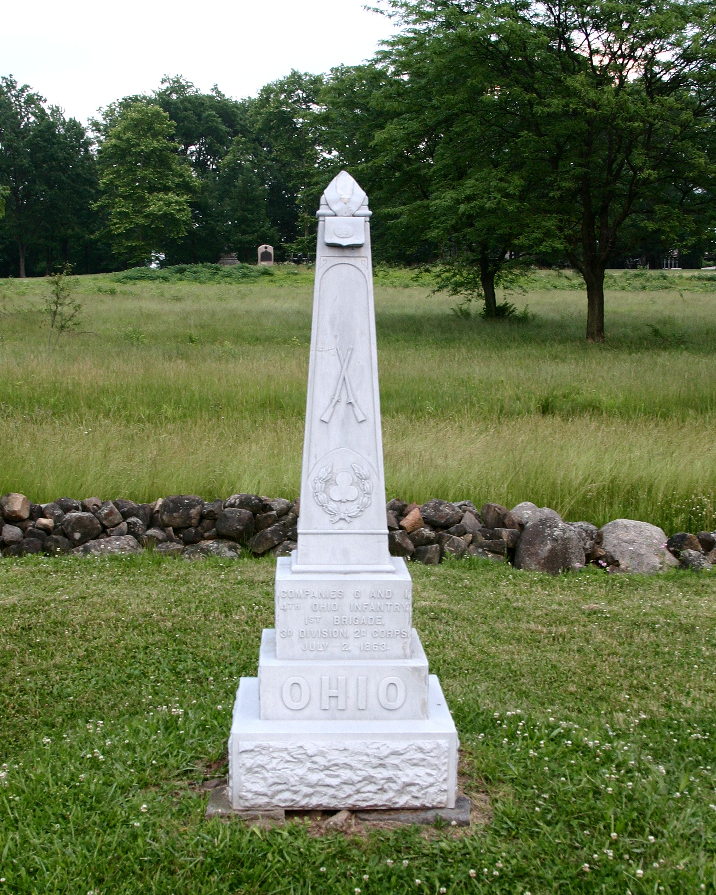 1 of 20 Mn to Ohio. Indicates location of Co's. G&I 3:00 PM July 2, 1863. Support to picket line, entered into repel of Longstreet's advance. LF&RF at 47' & 30,' respectively. Located E side Emmittsburg Road. || Mn & 2 Flank Markers. MN: 3 part stepped base, oblesik shaft, & pryamid cap. Base 2'3"sq, All 6'6"H. Simulated granite, but "zinc'd" bronze w/ excised letters, details & "rough-cut stone" base. LF&RF 1'2"sq x 1'6"H, zinc bronze w/ excised detail.