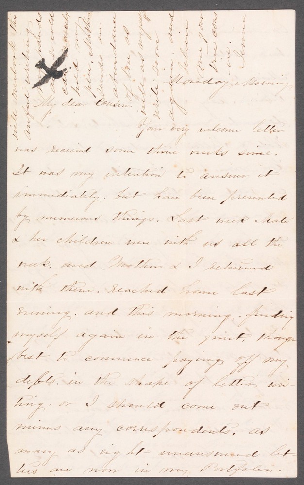 “Monday Morning My Dear Cousin, Your very welcome letter was received some three weeks since It was my intention to answer it immediately, but has been prevented by numerous things. Last week Kate and her children were with us all the week, and Mother and I returned with them, reached home last evening, and this morning, finding myself again in the quiet, thought best to commence paying off my debts in the shape of letters uniting or I should come out minus any correspondents, as many as eight unanswered letters are now in my Portfolio. On arriving home last night found two letters to greet me one from Mary Spackman and one from Hannah [Saris]. Mary says they have settled down to making shirts and that Kate and Sally are doing the same. How much I should love to peep in and see them all if they will only come out next summer wont we have a merry time. you will then be home and everything is so lovely in summer we couldn’t help enjoying ourselves. Waterloo at present is very dull no parties sociables or anything of the kind. in fact I would rather remain at home. I received a comic valentine from Maggie Faulkner last week It was the funniest affair I have seen this year she also favored me with a letter that remains to be answered among the rest. Last week while [-----] was here we was at Mrs Bakers to an Oyster supper, had a delightful time Walter was there also. Kit Draper & I intend going up to Em’s this week to pop corn When we go there we fell priveleged to do as we are a mind. Ben & Em join us and act as badly as any of us. Since I last wrote you have been to Seneca Falls to an Oyster supper at Mrs Haighs there were about thirty there enjoyed it seceedingly reached home about half past one rather late for one that pretends to keep good hours. Mrs Glover & Eleanora returned from NY last week they say Hetty Swift is so weak she cant help herself in the least It is not likely she will ever recover. she has consumption and dropsy together. Your little brother George had been quite sick with a cold but I believe is now better. have not heard from him since we returned from Clyde It is a lovely day, and sleighing delightful. I dont expect to take a ride but a walk think I should enjoy the latter the most as when riding am always cold I hope you will overlook this awful writing my hands are so cold can barley hold my pen. Mother sends an abundance of love as well as myself write soon again. and believe me your true cousin Jennie” [In same envelope with letter from Sarah M'Clintock Hunt, II dated 1/16/1853.]