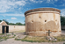 round mortuary chapel with 4 stone-topped gravemarkers, crosses, wall with gate open on west side