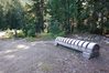 A large log with deep notches carved halfway into it and wrapped in a metal bar serves as a bike rack next to a trailhead.