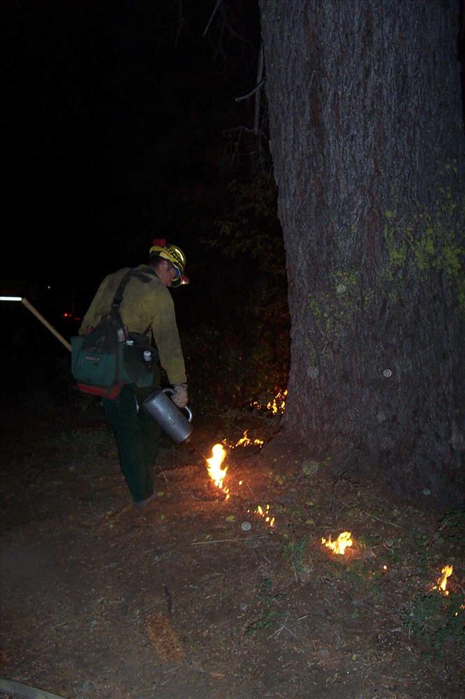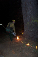 Prescribed fires are designed by management to achieve resource objectives, usually a combination of ecosystem restoration and reduction of high hazard fuel accumulations. The Sunset Fire burned 147 acres. Predominant firing technique consisted of blacklining combined with strip head fires. Although the park was in extreme fire danger at the time of burn, all other parameters were favorable. It was decided to commence ignition in the early evening and burn through the night, when conditions are more benign. These photos show various images of night burning, hotshot crew on ignition operations and ignition specialists at work.