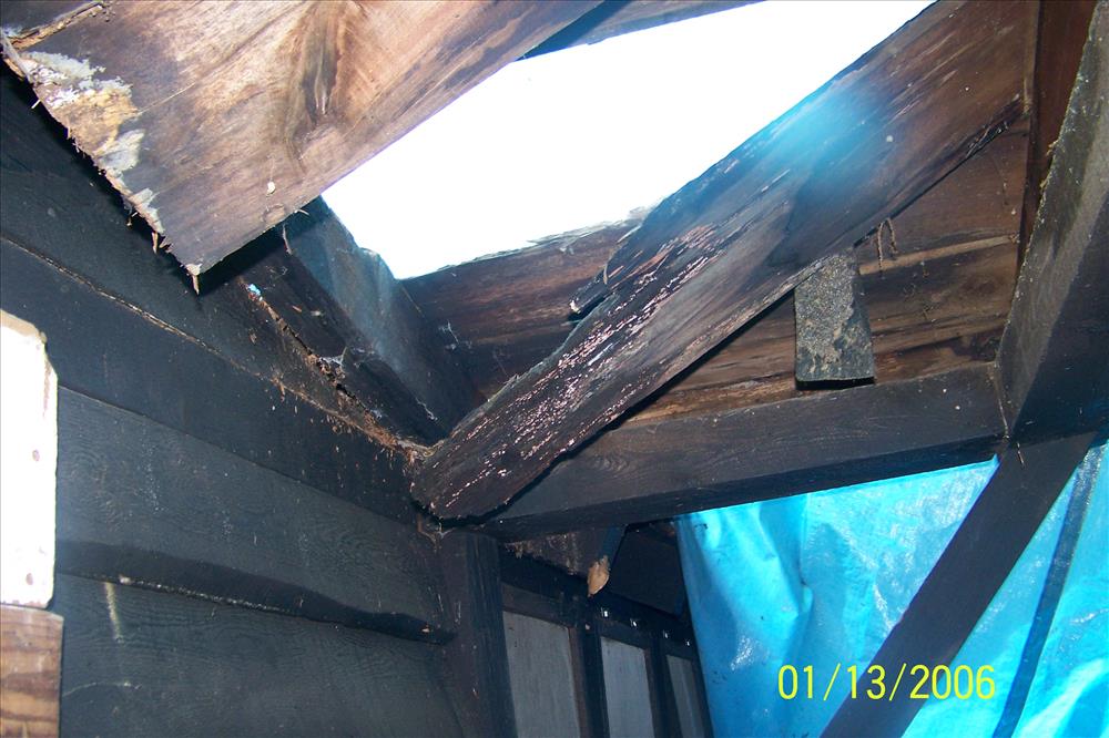 water damaged roof rafters at building 85 camp 1