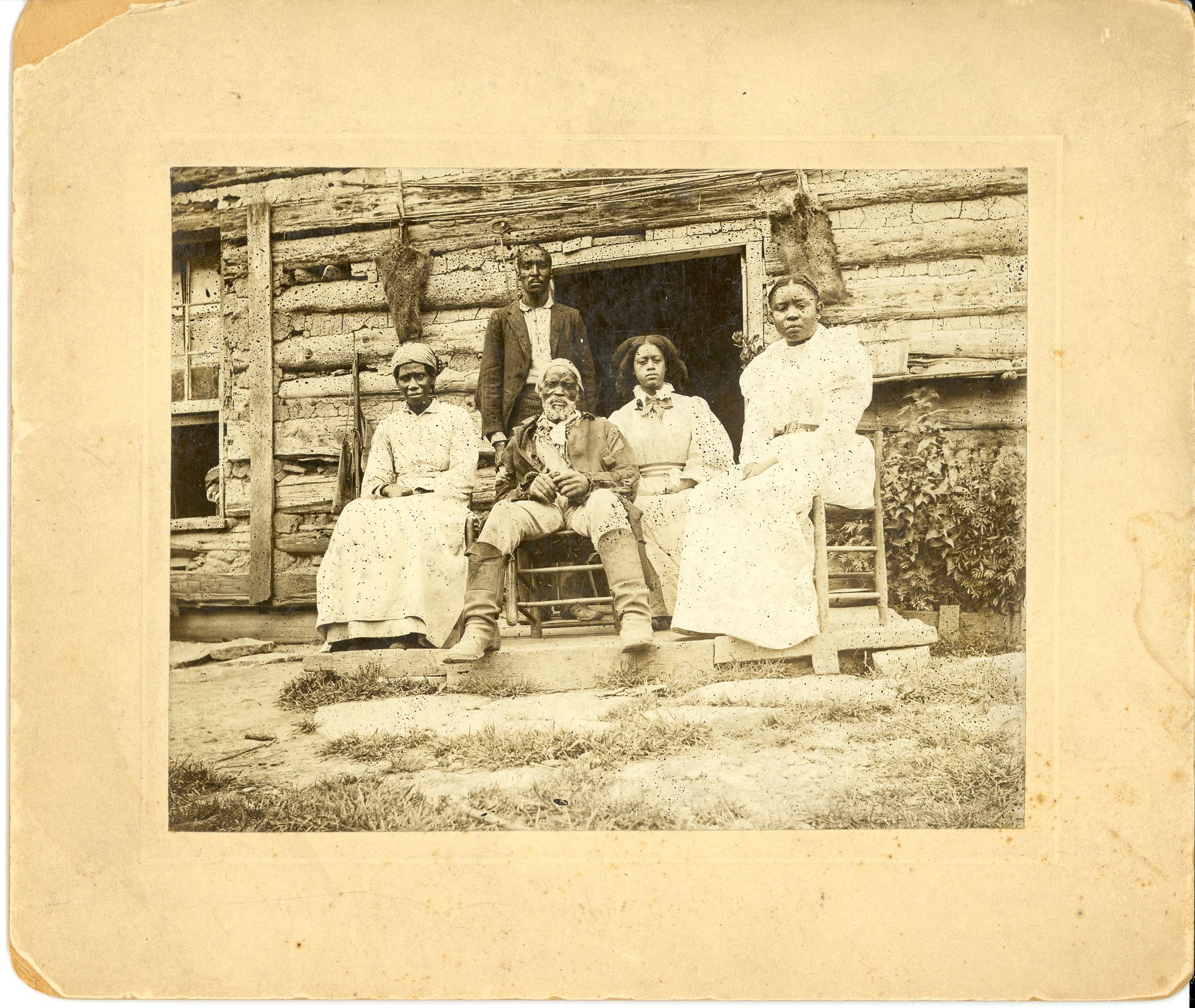 Courtesy of the National Park Service, Little Bighorn Battlefield National Monument, LIBI_00019_00247, Unknown Photographer, "African American Family in Front of a Log Cabin," circa 1865 .