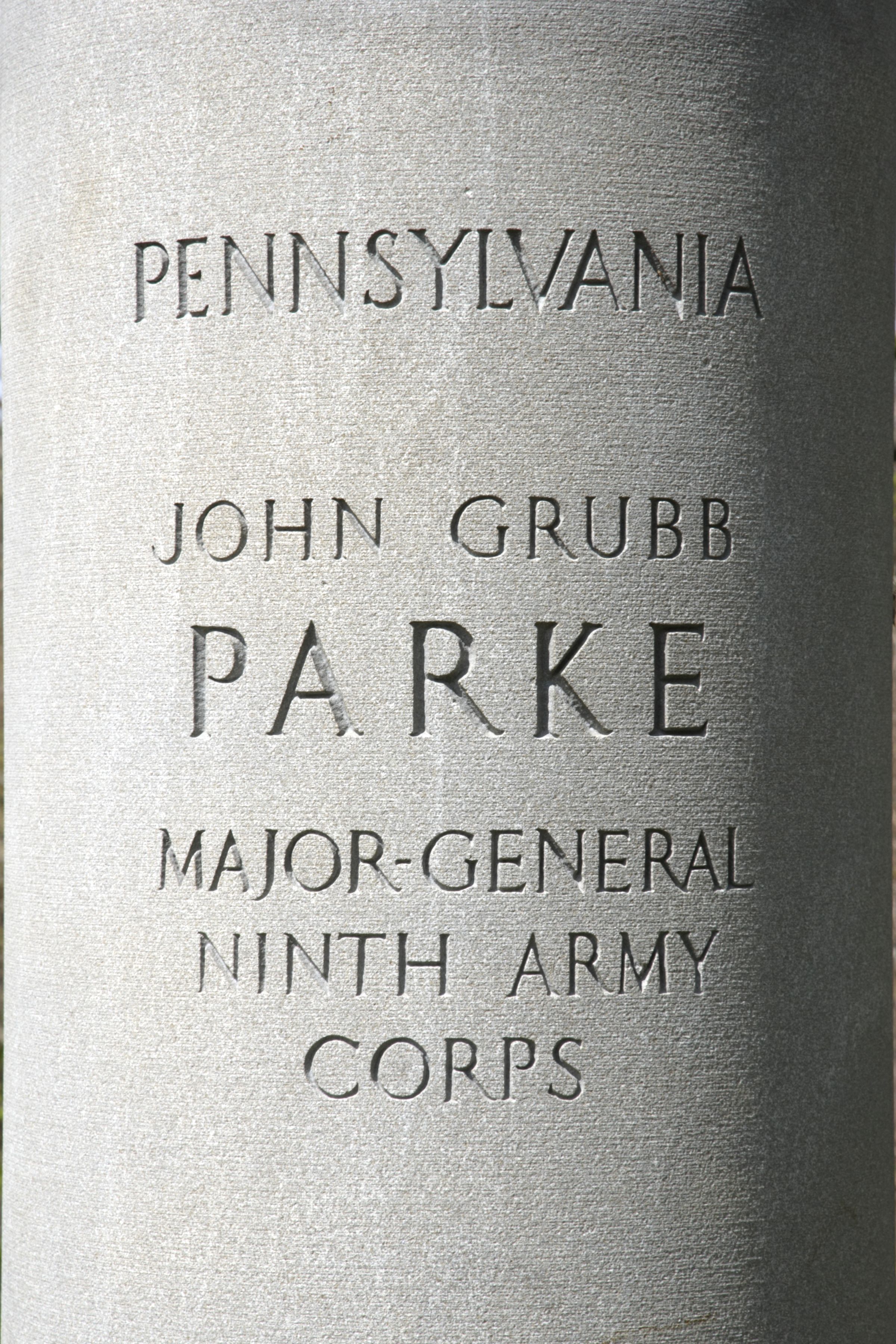 The gray granite monument consists of a 72" high, 36" diameter column resting on a 24" high tapered base and surmounted by a bronze wreath of oak leaves and a 30" x 24" x 36" bronze bust. The inscription is inscribed on the pedestal.