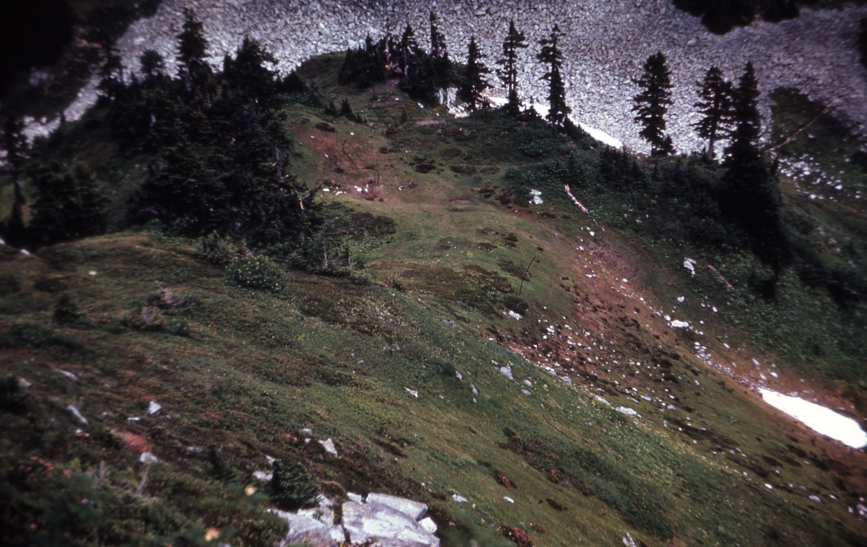 Cascade Pass, Patio, revegetation monitoring photograph. Text on slide frame reads: "REV/CAS/PAT/a-1, Cascade Pass, Duplicate, original by R. Coulter, 1978, see monitoring photos." (North Cascades NPS Complex Museum Collection, NOCA.0013 Revegetation Program Records, Series XI: Photographs, File 001 - Cascade Pass, Vicinity Impacts and Revegetation Sites, 1970-2004)
