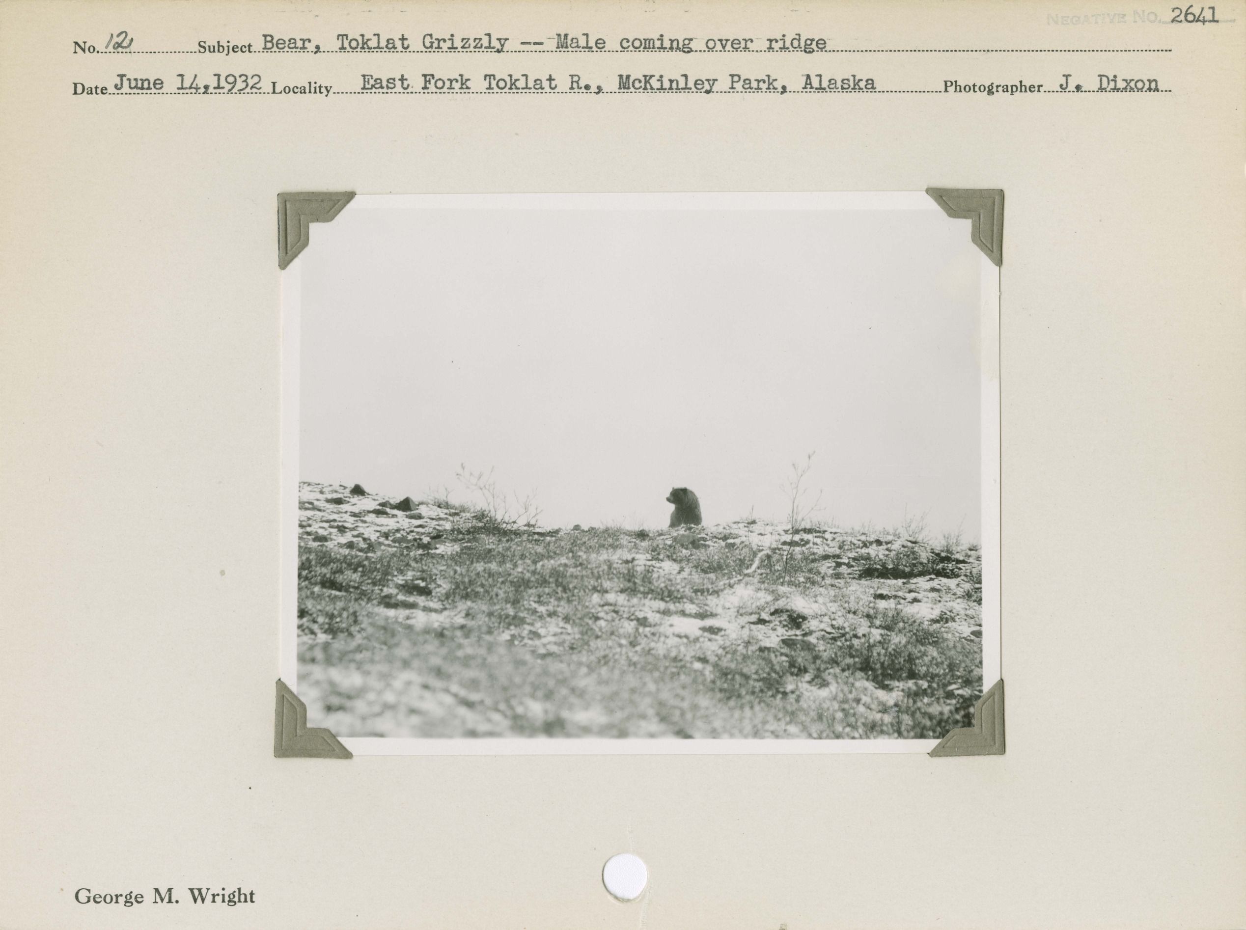 Bear, Toklat Grizzly – Male coming over ridge. Locality: East Fork Toklat R., Mount McKinley [Denali] National Park, Alaska. Negative #: 2641