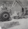 Excavator smoothing out road during construction near the Temple of Sinawava. ; ZION Museum and Archives Image 002.03.07-7of13 ; ZION 15933