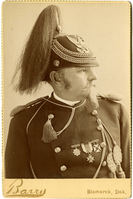 LIBI_00015_00646; An albumen cabinet card (card photograph) of Charles Ilsley in military dress wearing helmet. Left profile Original, long bust view; sepia-toned; studio portrait produced by D. F. Barry, circa 1876. Mount's edges and inscription are gilded or bronzed.; cabinet card [card photograph];Courtesy of the National Park Service, Little Bighorn Battlefield National Monument, LIBI_00015_00646, D. F. Barry, "Long Bust View of Charles Illsley Wearing Helmet," circa 1876