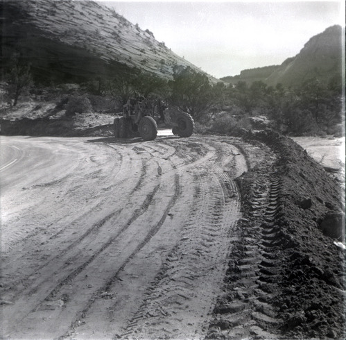 Construction vehicle during east side road repair and turn out construction. ; ZION Museum and Archives Image 002.13.01-33of53 ; ZION 15933