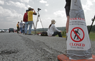 People standing at edge of road looking out in distance with a "closed to all travel" sign in foreground.