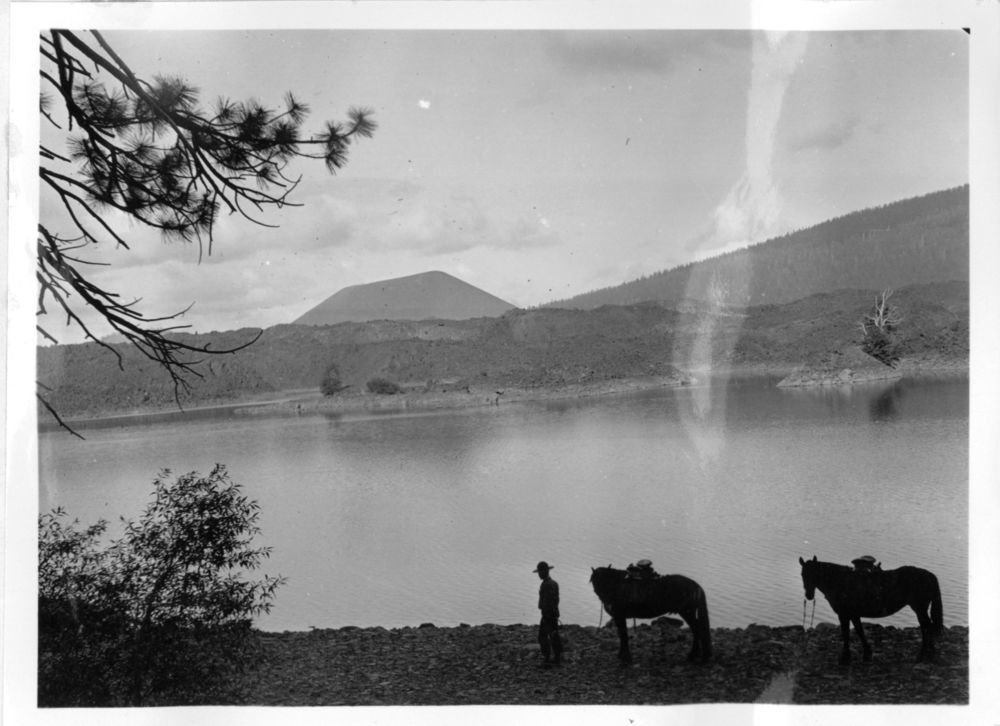 Administrative Collections: Album 9 (Miscellaneous) -Pack horses being led past Butte Lake on trip to plant loch leven fry in Teal Lake.
