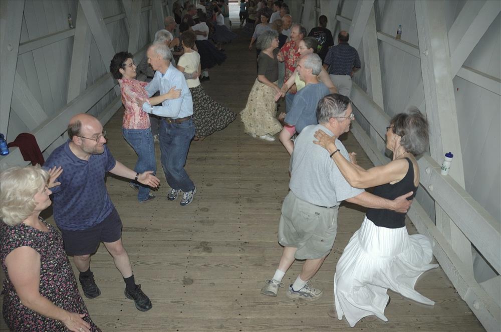 Contra dancers dance inside the Everett Road Covered Bridge to the music of Strings and Things and caller Carol Kopp. || New England Style contra dancing was probably brought to the Cuyahoga Valley by 19th century settlers arriving from New Hampshire, Connecticut, and New York. It is similar to square dancing and performed by couples facing in two opposite lines. Before each dance, the caller explains the figures while walking the dancers through them. Cuyahoga Valley National Park hosts contra dances twice a month.