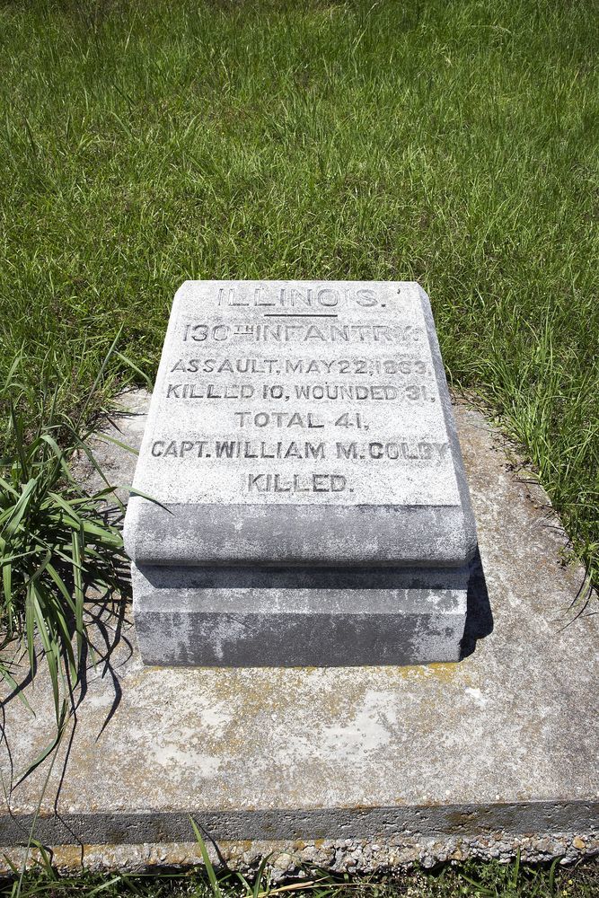 22" x 29" x 16" gray granite marker consisting of a nearly horizontal, scroll-form tablet with beveled sides and inscribed with "ILLINOIS", unit designation, and unit's casualties.