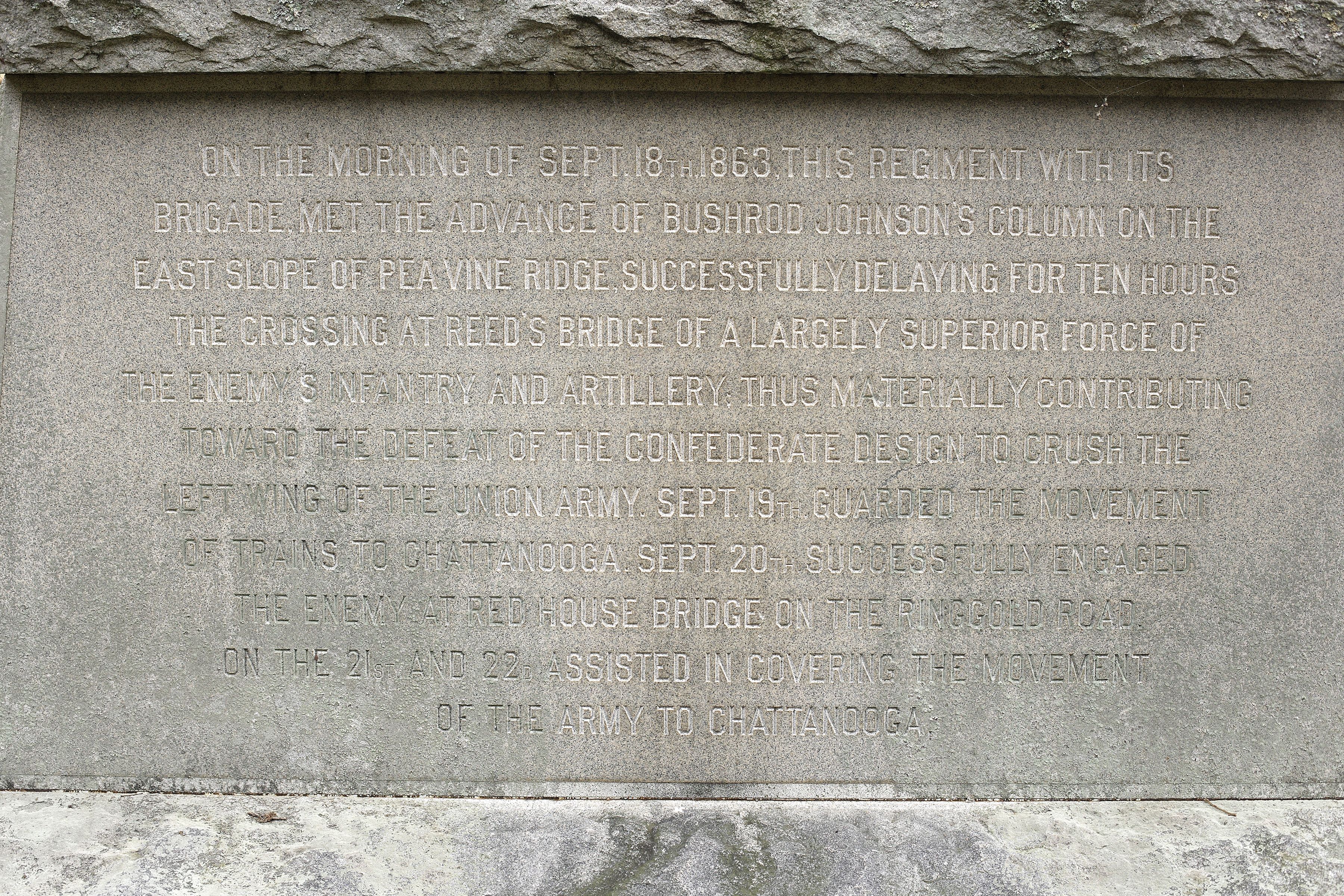 Monument contributes to national significance of park under NR Criterion A because it represents the national movement among veterans & related groups to commemorate Civil War battlefields. || 9' x 5' x 8', the rock-face monument of blue Westerly granite has a one-piece base and round-topped slab with a bronze base relief panel of soldiers at a bridge. Unit information is inscribed above the relief panel.