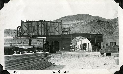 Scotty's Castle Main House looking west. Highlights Enclosed Patio arch wall connecting to Annex. February 6, 1927. Photographed by Mat Roy Thompson. Framing on original structure. Completed arch wall connecting Main House and Annex. View of Enclosed Patio. Construction material in foreground. Inscription on obverse in black ink on lower white border: 1521 / 2-6-27. 1521 refers to historic photograph numbering system. Black and White, 3 x 5 inch, horizontal format, matte finish. Mounted with black photo corners in photograph album.