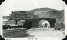 This is an historic black and white photograph from the Scotty's Castle Historic Photograph Collection, Death Valley National Park of Scotty's Castle Main House looking west. Highlights Enclosed Patio arch wall connecting to Annex. February 6, 1927. Photographed by Mat Roy Thompson.