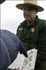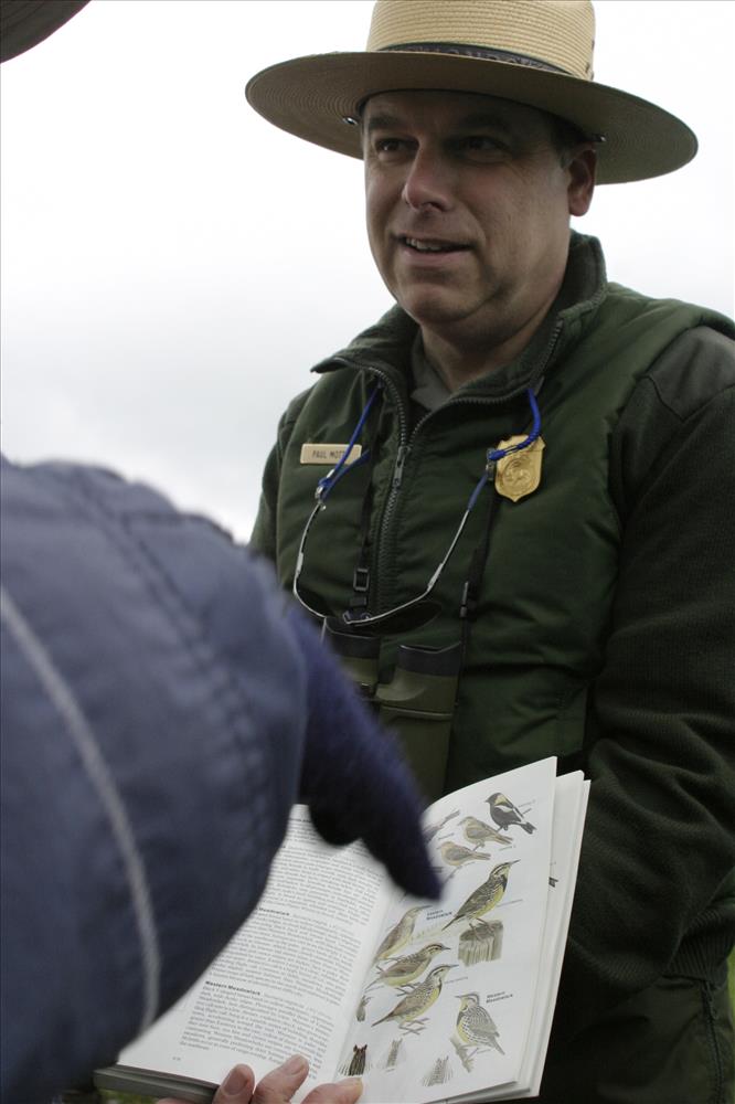 Cuyahoga Valley National Park is designated an Important Bird Area by the Audubon Society of Ohio, in part because of the restored grasslands at the site of the former Richfield Coliseum. A property once known for its sports/concert arena is now managed by the National Park Service as a grassland for rare birds. Cuyahoga Valley National Park offers year-round programs on bird watching. || Visitors bird watch with Park Ranger Paul Motts at an interpretive program called After the Coliseum in 2006. The program was an opportunity for local residents to learn how the park intends to manage this newly restored property.