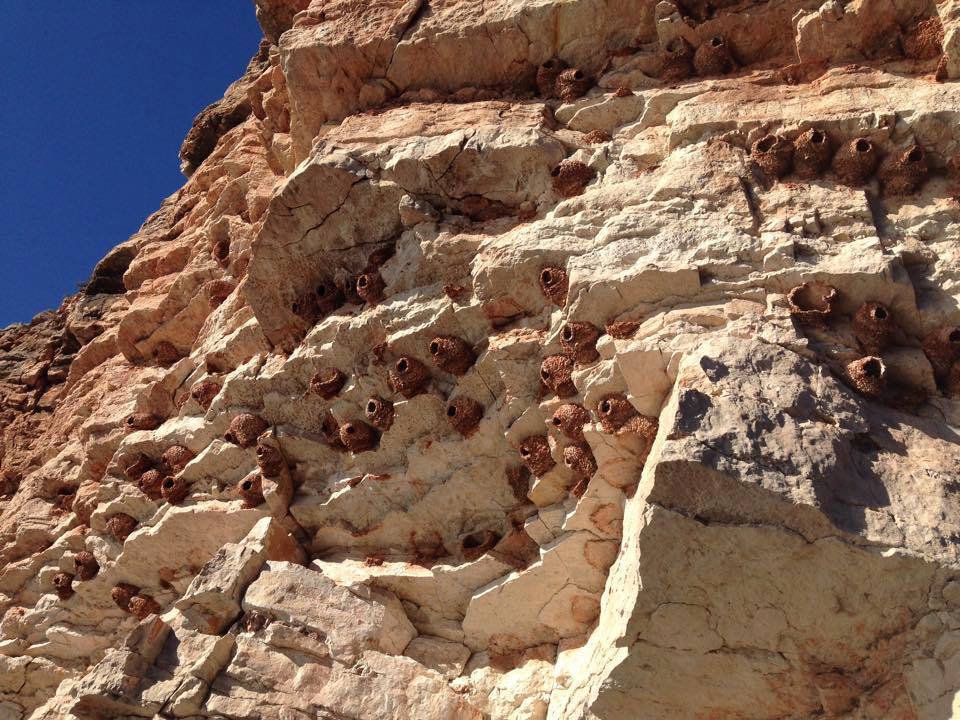 This colony of cliff swallow nests is found near Ok-A-Beh Marina. Cliff swallows have interesting colony behaviors: within a colony, some swallows lay eggs in other swallow's nests while some swallows lay eggs in their own nest and then actually carry that egg to another nest!