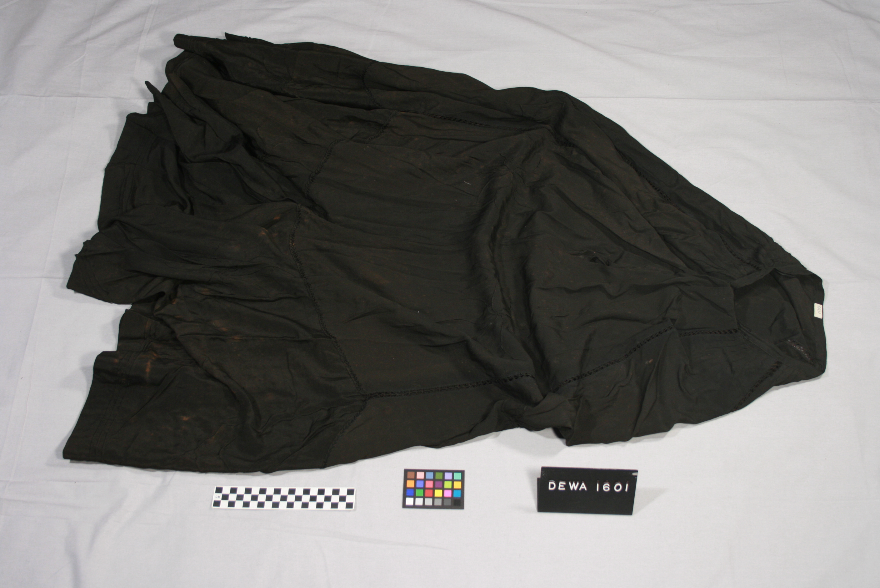 Black crêpe de chine skirt, pin tucked at waist and embroidered