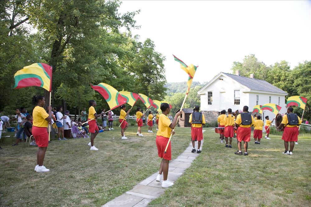 Cuyahoga Valley National Park (CVNP) and Cuyahoga Valley National Park Association present Get Up, Get Out & Go!, a campaign introducing recreational opportunities along the Ohio & Erie Canal Towpath Trail in Akron and the national park. The program targets residents in the urban neighborhoods surrounding the Towpath Trail in Akron which is a part of the larger Ohio & Erie Canalway, a national heritage area. Get Up, Get Out & Go! serves as an invitation for kids 11 to 14 years old and their families to give the Towpath Trail a try and to venture further along the trail into CVNP. || Visitors listen to an Akron youth marching band at the Get Up, Get Out, Go! kickoff event in June 2007.