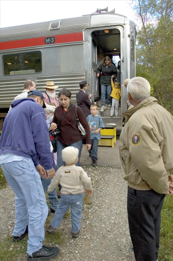 Cuyahoga Valley National Park partners with Cuyahoga Valley Scenic Railroad to offer a wide variety of public programs throughout the year. Campfire Train is offered each autumn. Visitors ride in historic train cars from Akron, Ohio to the Conrad Botzum Farmstead. On the train costumed characters tell ghost stories. At the farmstead visitors enjoy a campfire and hayride. || The history of trains in the Cuyahoga Valley stretches back more than 100 years. In 1880, the Valley Railway began operations, transporting coal to Cleveland, Akron, and Canton from the Tuscarawas River Valley and providing passenger service along the way. In the 20th century, competition from automobiles, trucks, and buses caused the decline of both freight and passenger service. Interest in the line was renewed in 1972 as a scenic excursion route. Originally known as the Cuyahoga Valley Line, the scenic railroad now operates as Cuyahoga Valley Scenic Railroad (CVSR) and is a popular way to enjoy this national park.