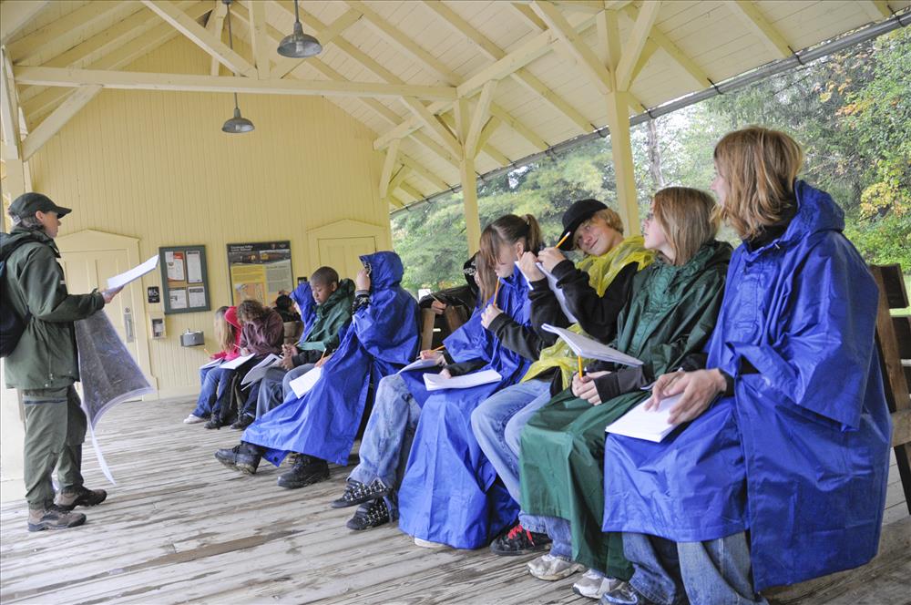 Middle school students are doing a site investigation at Chippewa Creek near Station Road Bridge Trailheadand. They are studying the impacts of suburban development on the local watershed. || The Cuyahoga Valley Environmental Education Center's residential program provides fourth through eighth grade classes an overnight educational experience that integrates science, nature study, environmental issues, and the arts. Students learn natural history and the concepts of watershed, biodiversity, and habitat. In addition, environmental issues and the process of environmental decision-making are explored. The curriculum is designed to meet state standards and teach proficiency skills, especially in science and social studies.