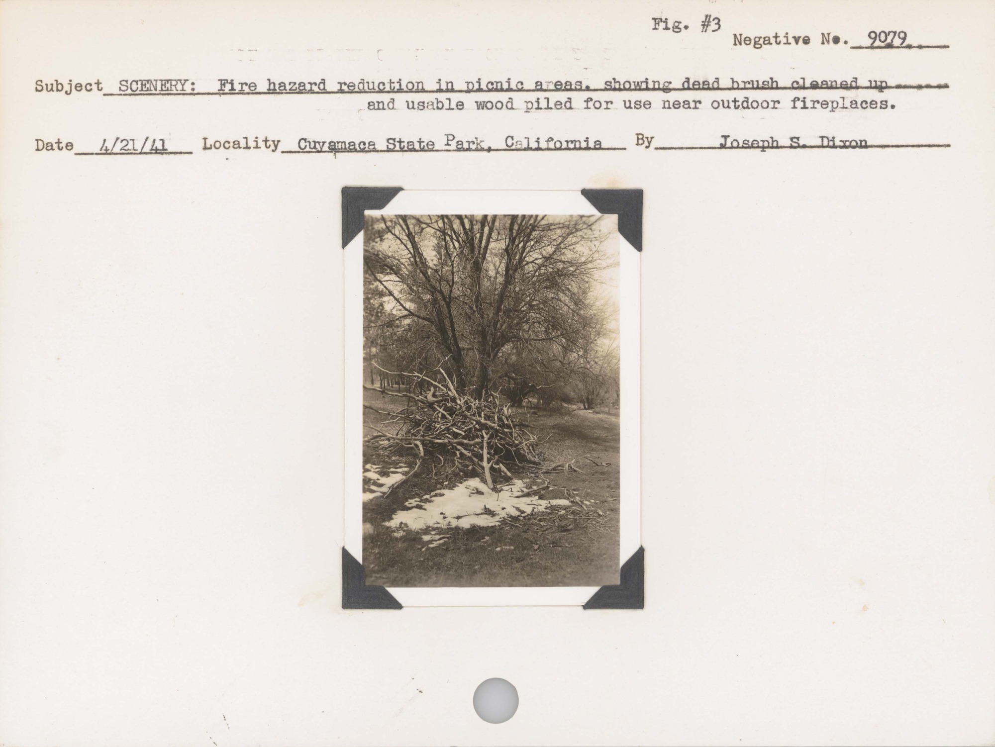 Scenery: Fire hazard reduction in picnic area. Showing dead brush cleaned up and usable wood piled for use near outdoor fireplaces. Negative #: 9079. Locality: Cuyamaca State Park, California.