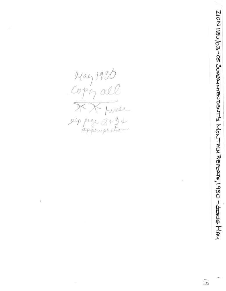Report on the conditions of Zion and Bryce for May, 1930 written on June 7, 1930.