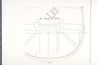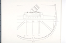 Cross-section of the hull of the British bomber (ship) "HMS Meteor" showing a mounted British 13-inch mortar and the heavy bracing needed to support the mortar.