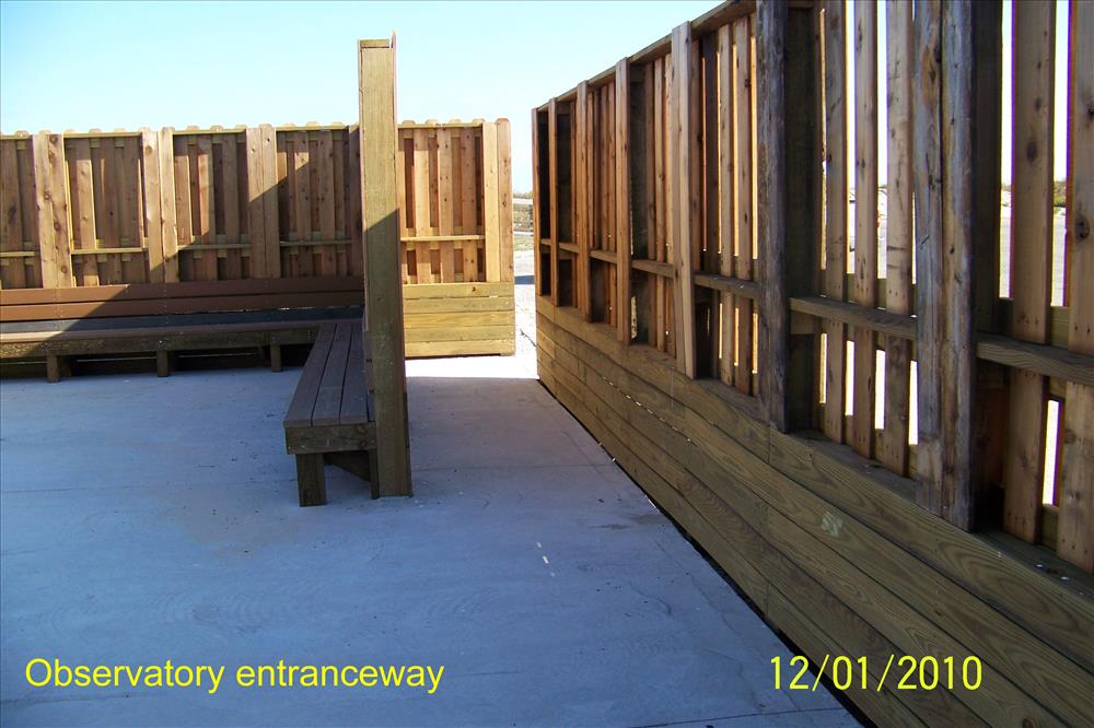 These photos show the recently built Malaquite Observatory. The observatory was built in response to a need to protect the telescopes used by amateur astronomers at star parties held at the park from the elements, which include wind, saline sprary from the nearby Gulf of Mexico, and the glare of headlights of visitors coming to attend the star parties. To combat these problems the park built this observatory, which has (1) a wall/fence made of closely-placed alternating slats to break up the wind (to minimize stress on the structure), but minimizing headlight glare (2) a concrete foundation to provide a steady support for the telescopes (3) benches placed around the inside perimiter for the comfort of people waiting to peer through the telescopes. Minor modifications will soon be made to allow some slats to be removed to allow telescopes to view objects lower than the top of the wall and a white section of the inner wall to act as a screen for slide shows. This facility will also be used during daylight hours as a teaching area for environmental education programs.