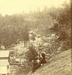 A man sits in the foreground on a hillside overlooking a few small wooden structures and trees. A creek is visible in the background with a plank bridge crossing it.