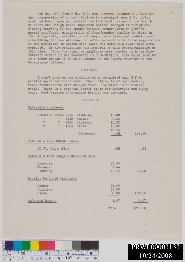 SHELTER, CRAFT. CAMP 3. JOB #270.<CRCAMP 3. INCLUDES JUSTIFICATION, SPECIFICATIONS. JOB APPLICATION & COMPLETION RECORD. MAN D<CRREVISIONS. MATERIALS LOCALLY PRODUCED AND PURCHASED. DISCRIPTION AND COST. MATERIALS FROM<CRFROM OTHER SOURCES.<CR#, THRU , SAME FILE FOLDER. CAMP 3. CORRESPONDENCE. REDUCTION OF CONTOUR LOCATION MAP.<CRSTAPLES, RUST, CARBON TRANSFER. YELLOW PAPER. TORN.