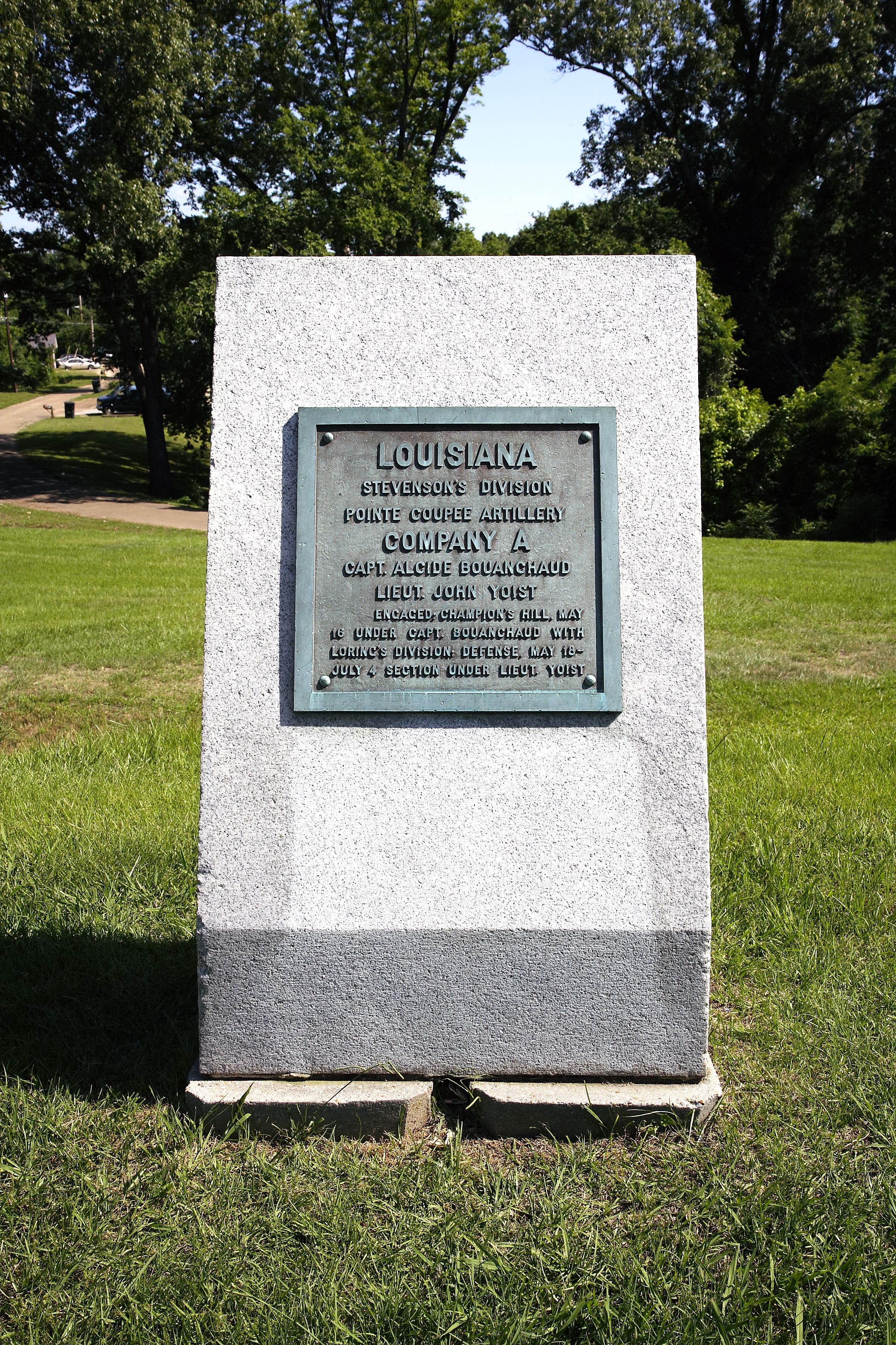 3'4" x 2' x 5'3", this is a hammered-finish, rectangular gray granite monument with a sloping face. Attached to face is a rectangular bronze inscription tablet with unit designation and campaign history.