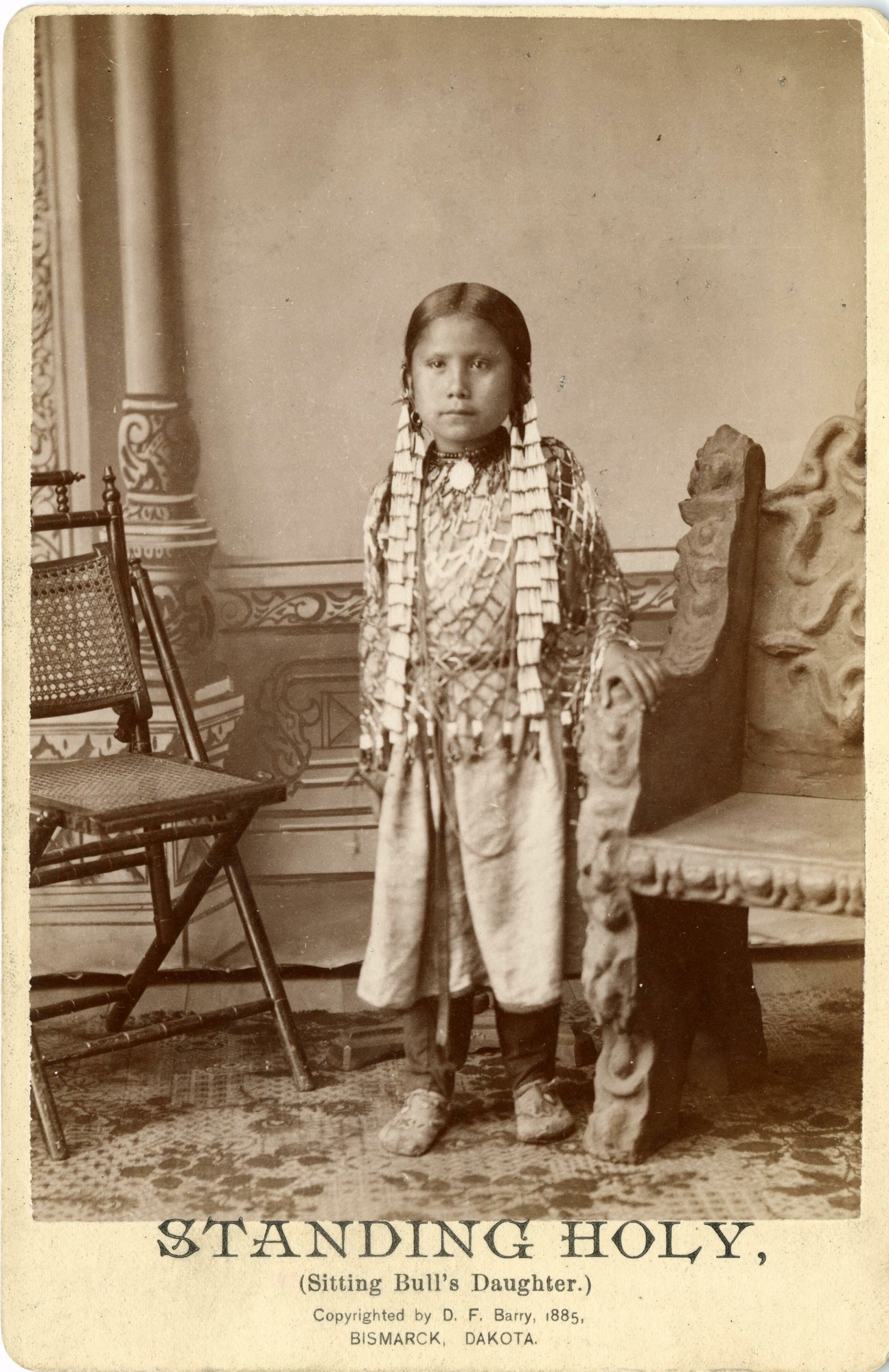 LIBI_00019_00180; This item is an albumen cabinet card (card-mounted photograph or studio portrait) of Standing Holy, daughter of Sitting Bull, wearing dentallium shell hair ties. The full view photograph is 4 x 5 3/4" (4 1/2 x 6 1/2" mounted) and was produced circa 1885 by David F. Barry. On the front, the typed notation on the card reads, "Standing Holy, (Sitting Bull's Daughter.) Copyrighted by D.F. Barry, 1885, Bismark, Dakota." The photographer's stamp is embossed in gold ink on the verso.Note: "Pkg 1/Box 1" handwritten on verso.; CABINET CARD [Card photograph]; Courtesy of the National Park Service, Little Bighorn Battlefield National Monument, LIBI_00019_00180, D. F. Barry, "Standing Holy, Daughter of Sitting Bull, with Dentallium Shell Hair Ties," circa 1885