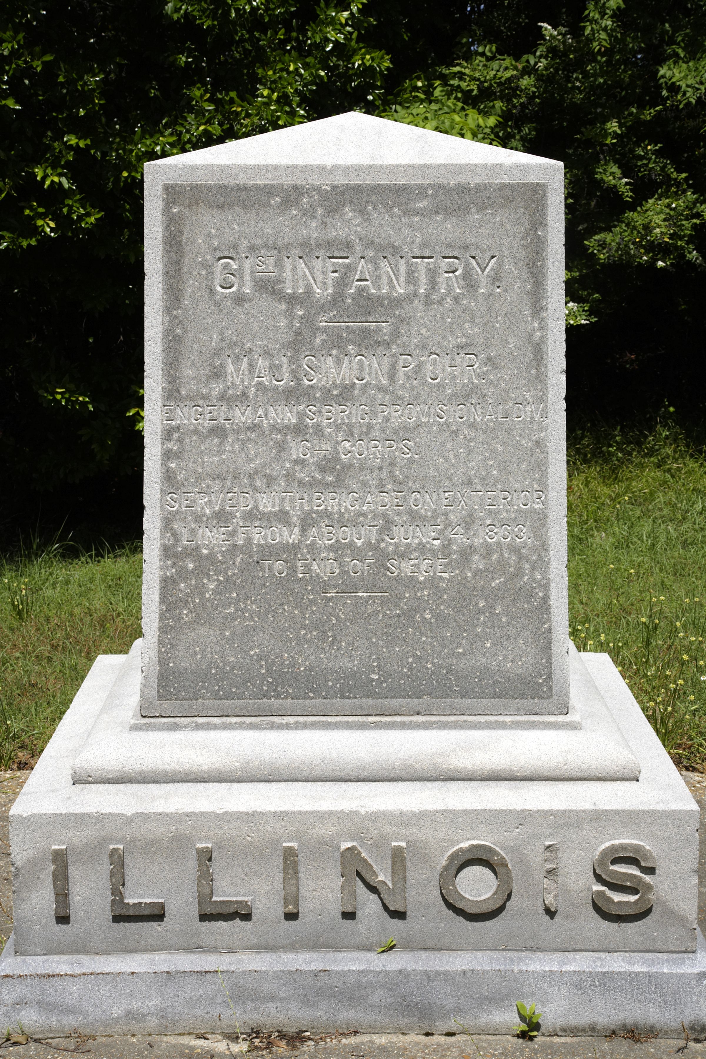 5' x 4'2" x 6'6", gray granite monument has double step base supporting an obelisk. ILLINOIS is in raised polished letters on 2nd step; face of obelisk is polished and inscribed with unit designation, commanders, campaign record.