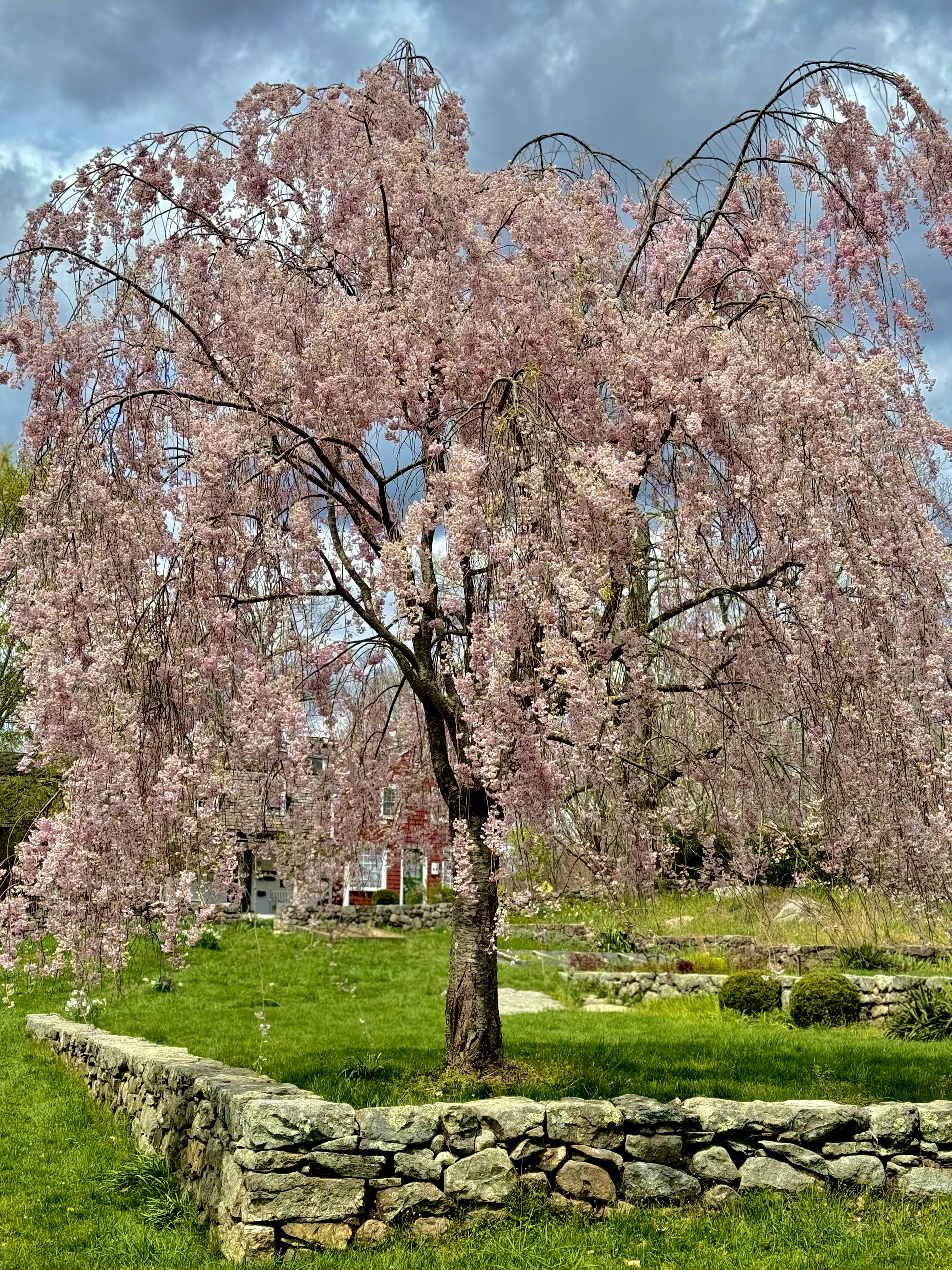 A tree with pink flowers blooming, above a stone reattaining wall