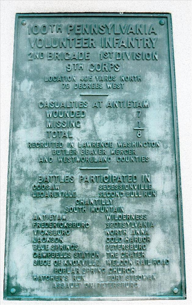 Commemorative monument erected to honor those who served & died during the Battle of Antietam on Sept 17, 1862. Dedicated to the 100th PA Vol Inf "Roundheads", 2nd Brg, 1st Div, 9th Army Corps.