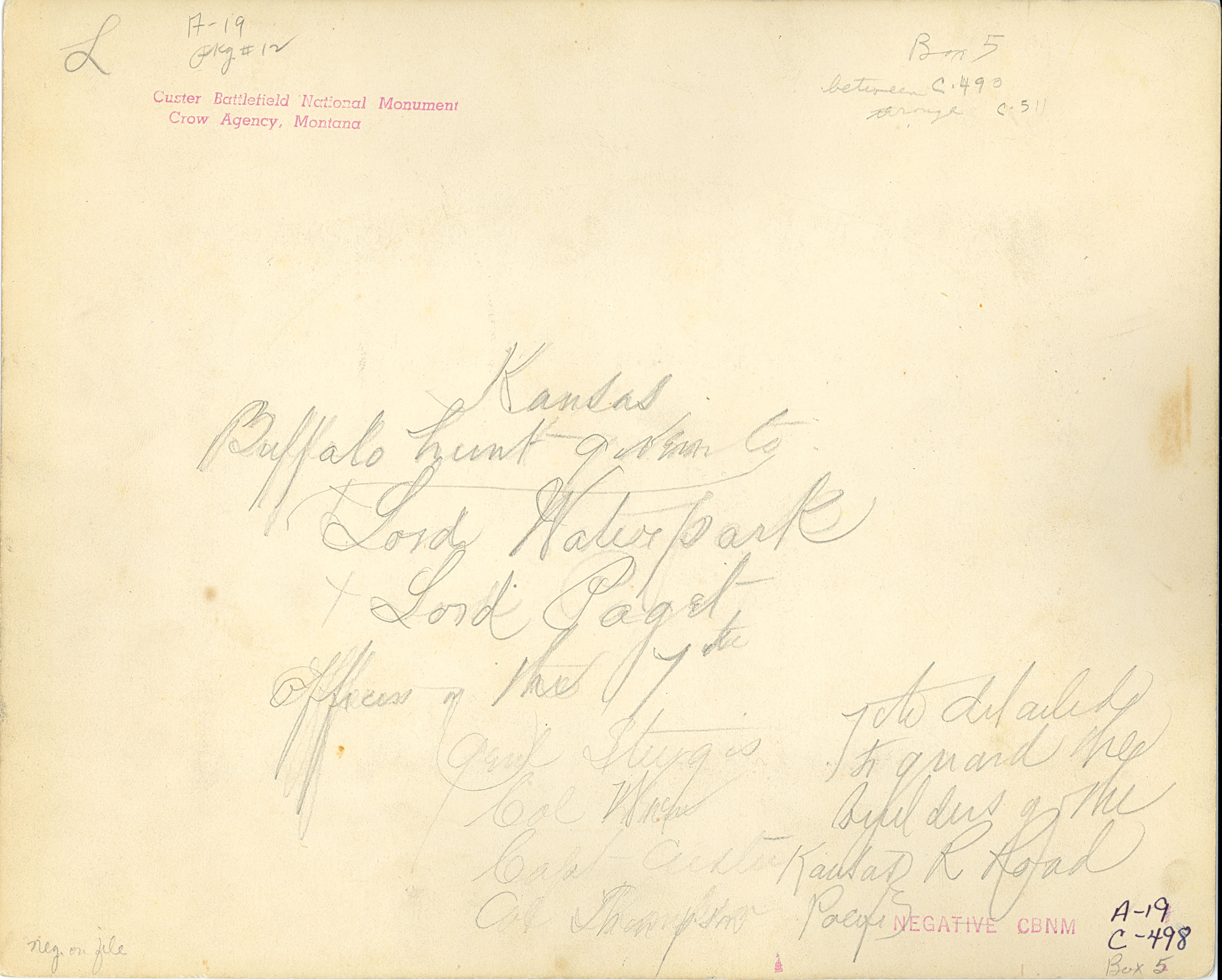LIBI_00019_00498; This item is an original albumen, card-mounted photograph of a group of 14 people and several dogs in front of a tent on a buffalo hunt while camped near Fort Hayes, Kansas. The photograph is 4 3/4 x 7 1/2" (8" x 9 7/8" mounted"). As noted on page 85 of D. Mark Katz's book, the image was produced in 1869 and is attributable to W.J. Phillips of Preston, Missouri. Katz identifies the subjects, from left to right, as: Lieutenant Colonel George A. Custer, Miss Talmadge, Captain William Thompson, Lord Waterpark, Lord Paget, Lieutenant Myles Moylan, Captain Thomas Weir, Colonel Samuel D. Sturgis, Lieutenant William W. Cooke, Mrs. Elizabeth B. Custer, Lieutenant Thomas W. Custer, Captain Brewster, Mrs. Godfrey and Mr. Talmadge. On the front, a handwritten notation in pencil reads, "A. and 2 English guests/Col. Weir/G.A./Col. Thompson/Col. Cook/Gen'l Sturgis/Tom Custer." On the verso, a handwritten notation in pencil reads: "Kansas/Buffalo hunt given to/Lord Waterpark/Lord Paget/Officers of the