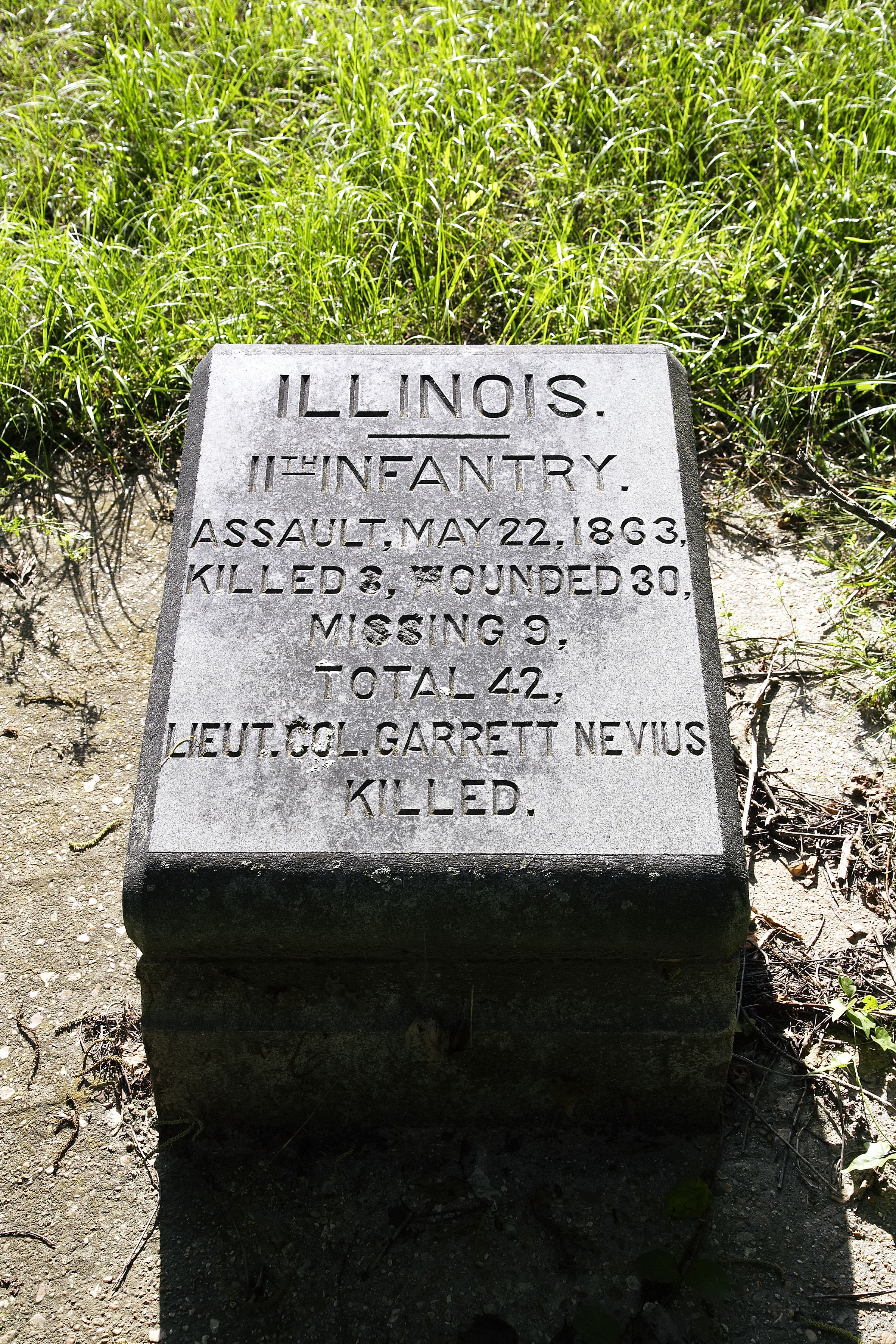 22" x 29" x 16" gray granite marker consisting of a nearly horizontal tablet with beveled edges and inscribed with "ILLINOIS", unit designation, and unit's casualties.