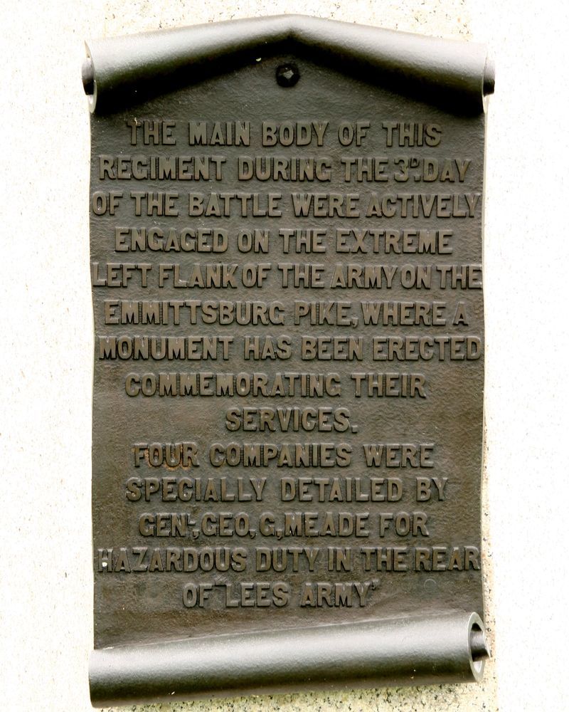 1 of 110 Penn. Mns. Erected between 1888-1893. Mn indicates 6 Penn. Cav. Comp. E & I positions when they served as escorts to Meade. Located on Leister Farm front yard until moved between 1961-1962 to present site just N of Leister Farmhouse. || 6 sided, smooth faced, 2'-6" base w/carved quarter round molding. 6 sided, smooth faced shaft w/2 bronze inscription scroll & cav. sabers attached. All 7'6" high.
