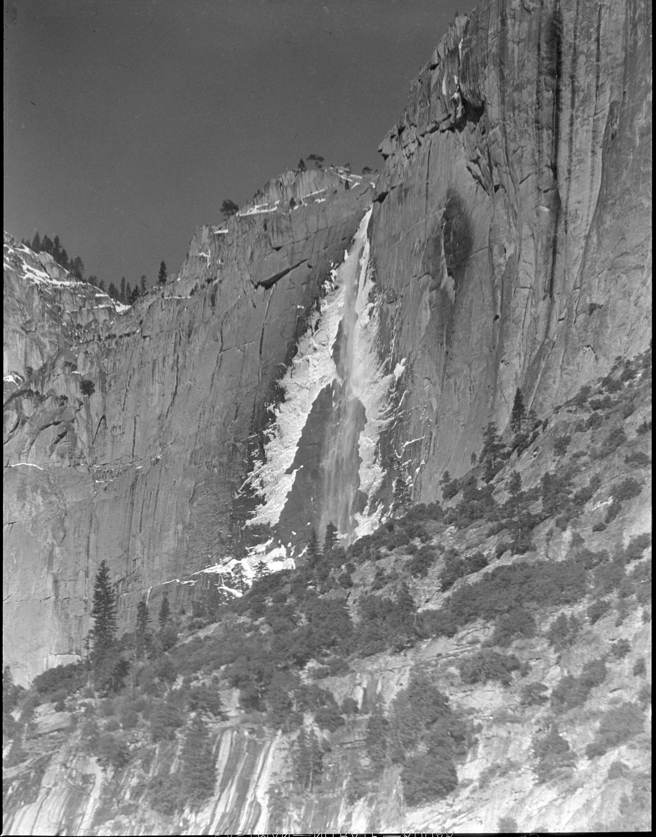 Yosemite Falls. Upper fall from roadside west of Chapel. Record of snow cone demise.