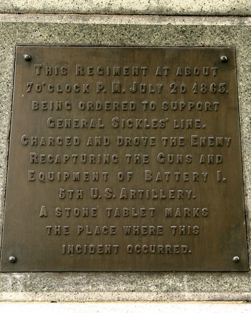 1 of 90 Monuments to New York. Indicates battle line position 39th NY Jul 2-3, 1863. Postion Marker located at area recaptured by Watson's US Battery. Mn located E side Hancock Av. Position Marker located in field. || MN, RF&LF Markers & Position marker. Mn: 3 part step base, fnd 7'sq. 4 Part shaft. Top: pryamid w/trefoil. All 20'H. Excised inscription 2nd shaft part w/bronze tablet reverse, bronze medallion in front. LF&RF: 1'sq x1'.