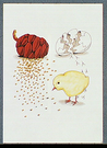 A chicken hatched from its egg with a pine cone showing loosed seeds.